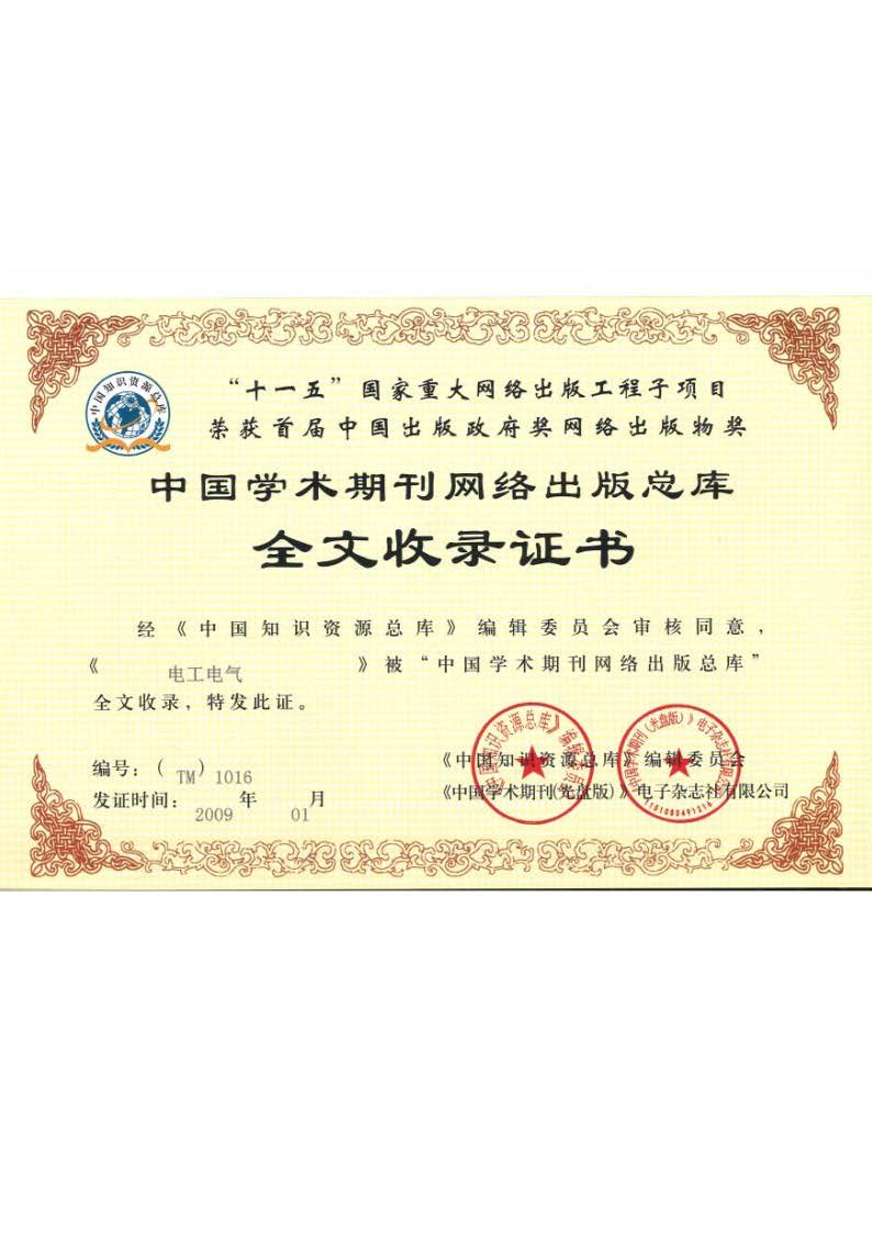 中文科技期刊数据库收录证书(电工电气杂志社)